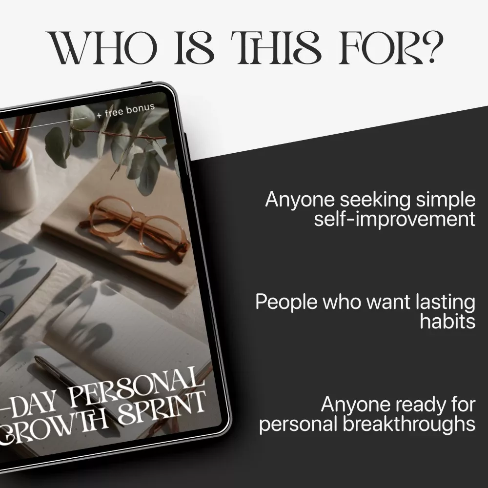 Unlike long planners or overwhelming workbooks, the 7-Day Personal Growth Sprint focuses on short, intentional action with fast results. It removes guesswork by guiding you step-by-step through one focused theme, with built-in check-ins and reflections. This makes it powerful for real-life routines, not just ideal situations.