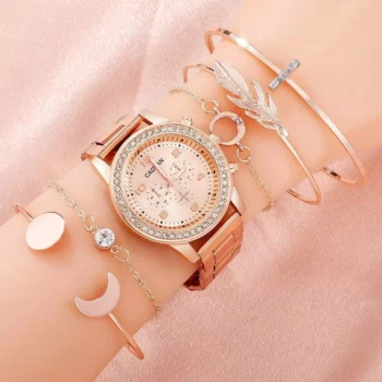Rose Gold Rhinestone Watch & Bracelet Set for Women
