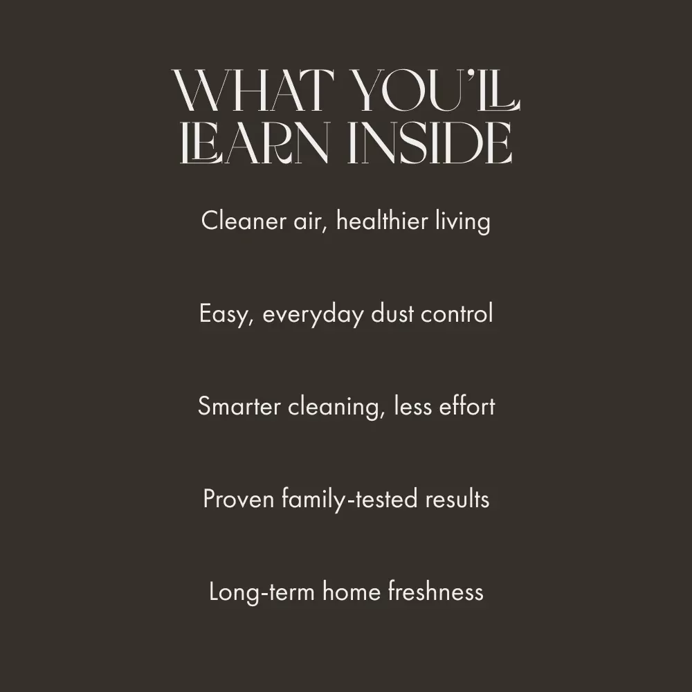 This eBook is perfect for homeowners, renters, allergy sufferers, and anyone tired of seeing dust settle right after cleaning. If you’re ready to make lasting changes and want practical results without frustration, this guide is for you.