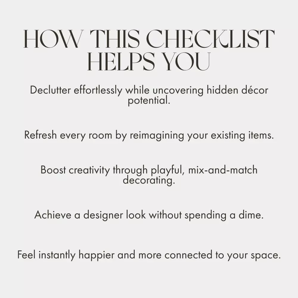 Unlike other décor guides, this checklist focuses on creativity and resourcefulness—not shopping. It’s about seeing your home in a new light and styling it with what you already have. No clutter, no spending—just fresh inspiration and instant results.