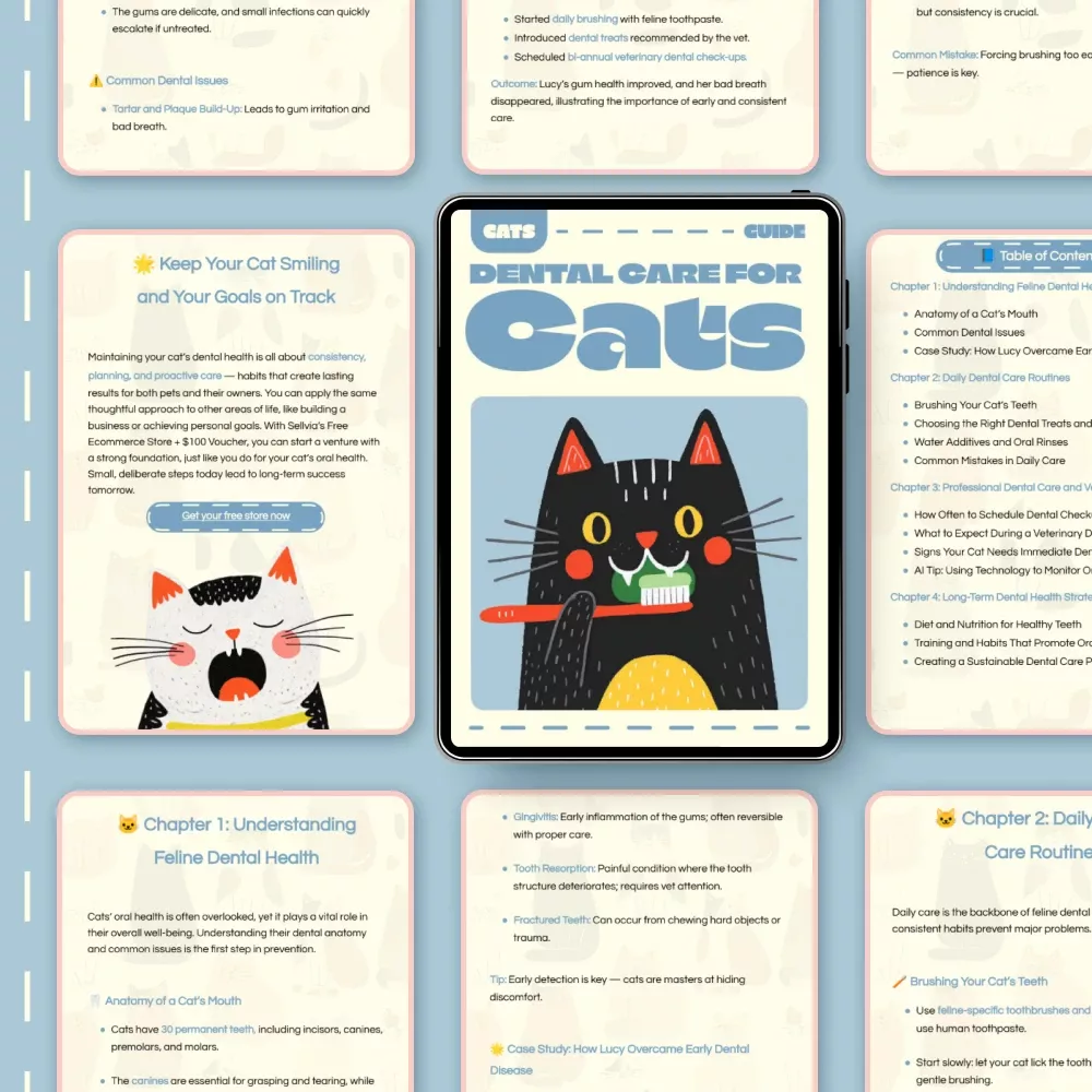 Keep your furry friend’s smile healthy and bright with Dental Care for Cats—a detailed, easy-to-follow digital guide designed for every cat parent. This downloadable eBook gives you everything you need to understand, maintain, and improve your cat’s oral hygiene from home, saving you costly vet visits and ensuring your cat’s long-term comfort and well-being. Whether you’re a new pet owner or a seasoned feline lover, this resource makes cat dental care simple, affordable, and effective.