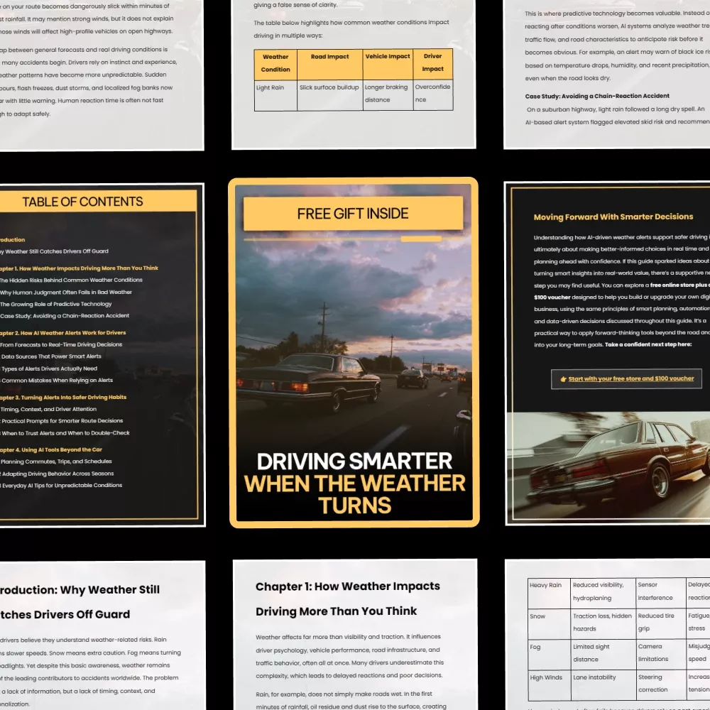 Bad weather doesn’t have to mean bad decisions. Driving Smarter When the Weather Turns is a practical, easy-to-follow ebook designed to help everyday drivers understand how weather truly affects the road—and how modern tools can help you stay one step ahead. Instead of reacting too late, this guide shows you how to use AI alerts for weather-related driving to make calmer, safer choices before risk escalates. Whether it’s rain, fog, heat, or sudden storms, you’ll learn how smarter awareness leads to better outcomes behind the wheel.