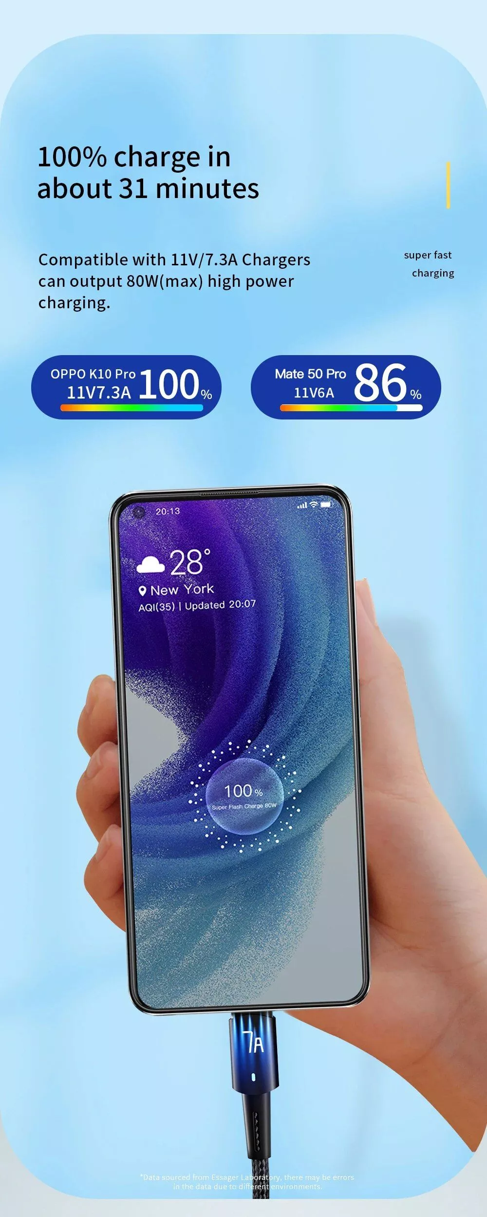ESSAGER USB A to USB C Cable build in intelligent chip,which ensures safe charging up to 80W (11V/7.3A)MAX power output for your mobile phones at full speed.The laboratory test mobile phone model is OPPO k10 pro