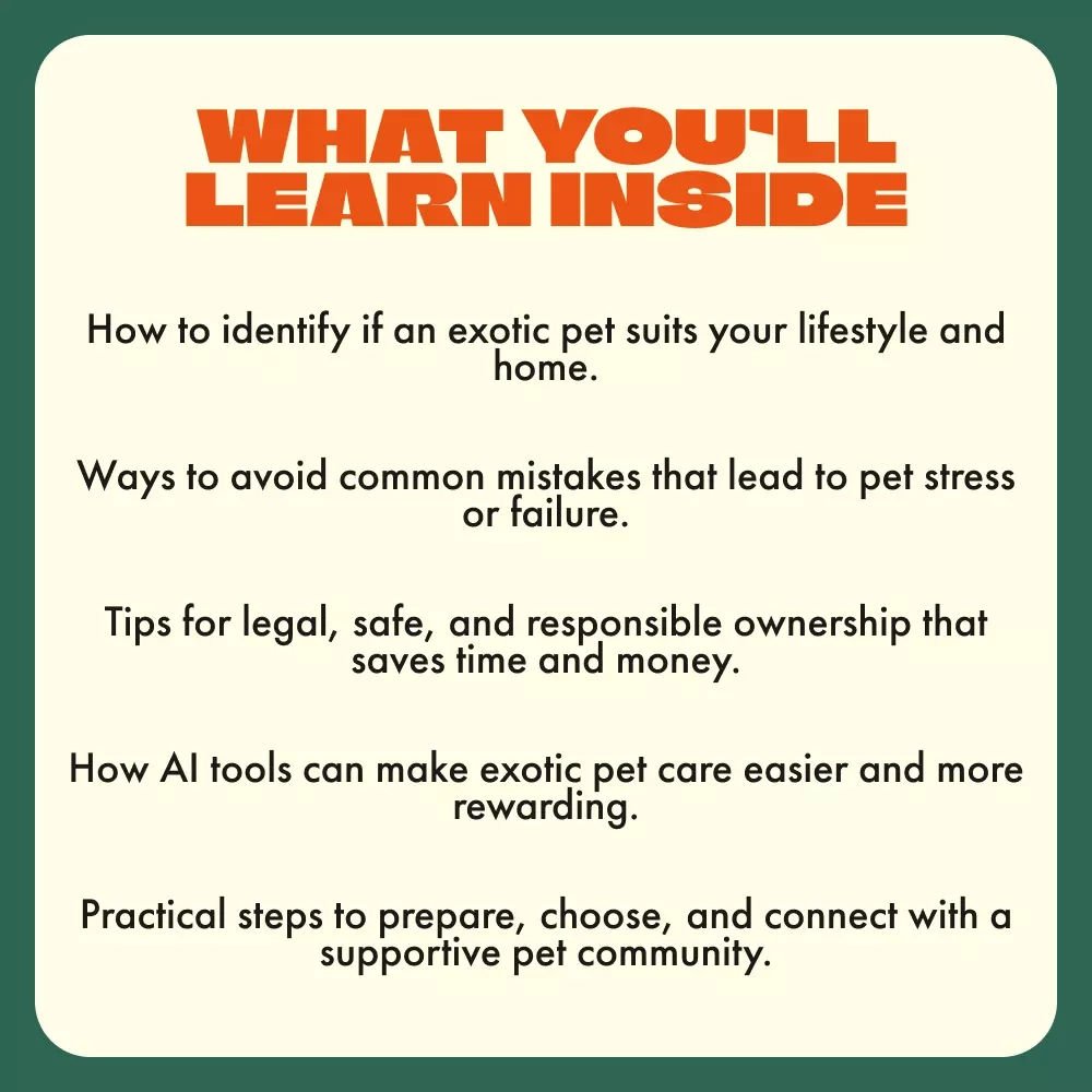Unlike generic guides, Exotic Pets: Weighing the Pros and Cons blends expert research, real-life stories, and cutting-edge AI applications to give you a complete, 360° understanding of exotic pet ownership. It doesn’t just inform—it prepares you for real-world experiences.