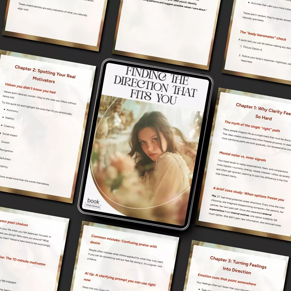 Unlike generic self-help resources, Finding the Direction That Fits You doesn’t push one-size-fits-all answers. It blends psychology, structured reflection, real case studies, AI prompts, and practical experiments in a calm, non-judgmental way. It focuses on progress instead of perfection and gives you tools you can reuse whenever you feel lost again.