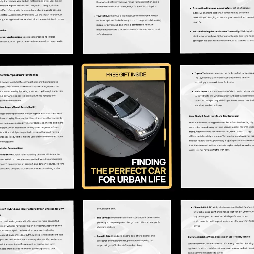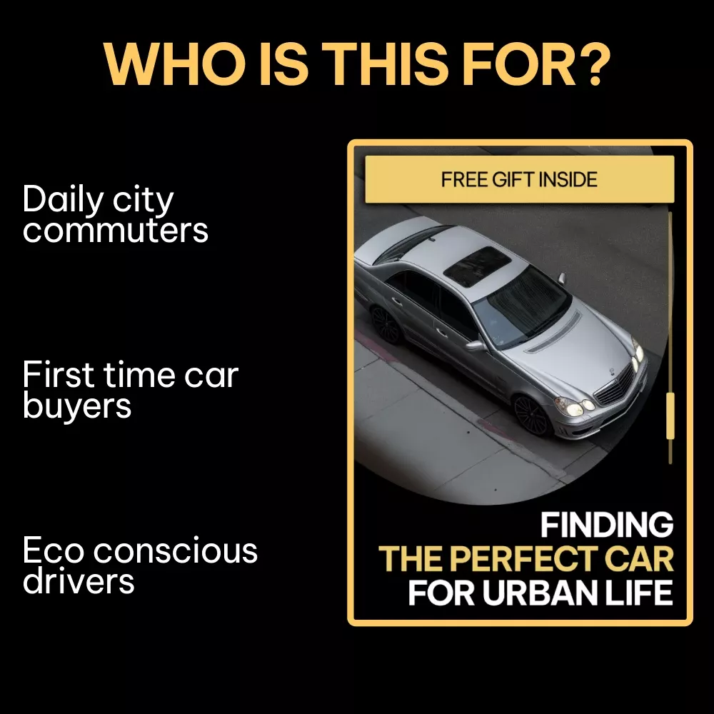 Unlike generic car guides, this ebook focuses entirely on urban driving realities. It combines vehicle recommendations, technology insights, and real-world scenarios into one streamlined resource that’s practical, unbiased, and easy to follow.