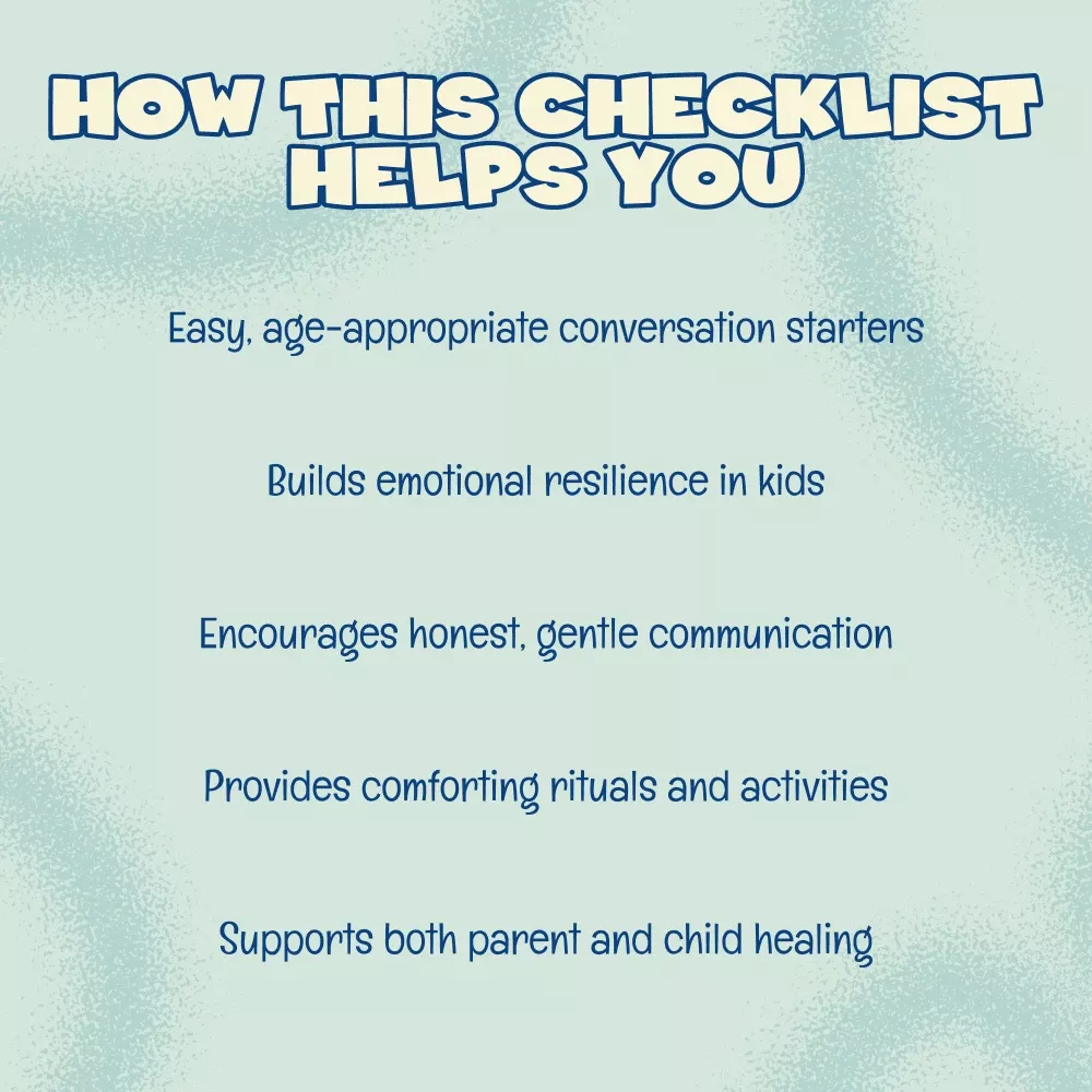 Download the Gentle Conversations: How to Talk to Kids About Death Checklist today and feel confident guiding your child through life’s toughest questions with honesty, patience, and love. Give yourself the peace of mind and your child the comfort they deserve—start your journey toward gentle, healing conversations now.