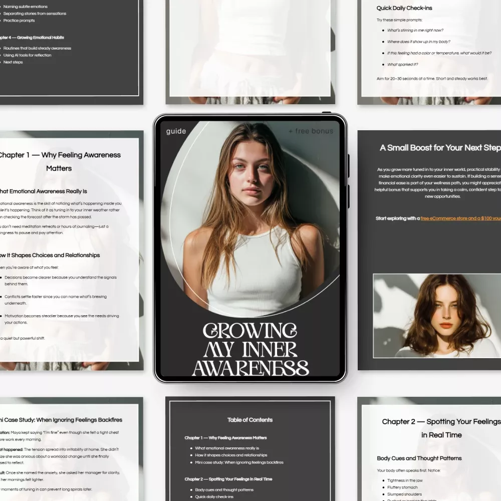 Growing My Inner Awareness is a powerful digital guide designed to help you notice, understand, and strengthen your emotional life with calm clarity. If you often feel disconnected from your emotions, overwhelmed by them, or unsure how they influence your decisions and relationships, this guide walks you step by step into a more conscious, grounded version of yourself. Written in a supportive, easy-to-follow style, it combines psychology, mindfulness, and modern AI tools to help you build lasting emotional awareness habits you can actually stick with.