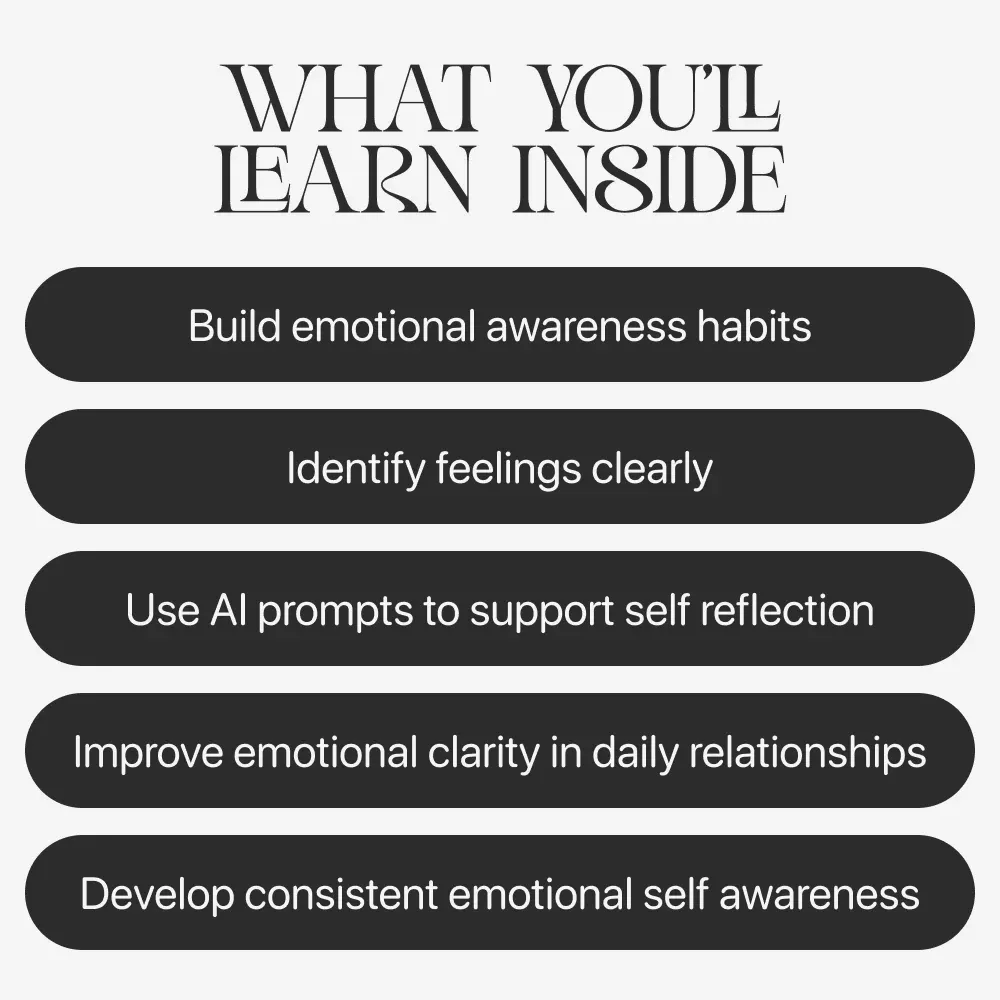 This digital download includes a structured, beginner-friendly emotional awareness guide that blends science and self-reflection. Inside, you’ll find clear explanations, real-life examples, practical exercises, and an exclusive section on Using AI tools for reflection to support your emotional growth. The guide also includes modern journaling techniques, reflective questions, and actionable routines for daily practice.