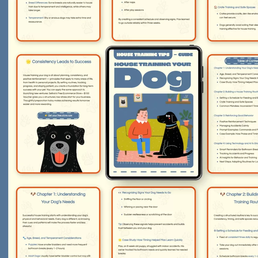 Discover the ultimate step-by-step resource for new dog owners! House Training Your Dog is a comprehensive digital eBook designed to help you build a strong foundation of trust and consistency with your furry friend. Whether you’ve just brought home a playful puppy or you’re helping an older dog adjust to new routines, this guide simplifies every step of house training with proven methods, expert insights, and modern tools. Easy to follow and filled with real-life examples, it’s your go-to training companion for a cleaner home and a happier pet.