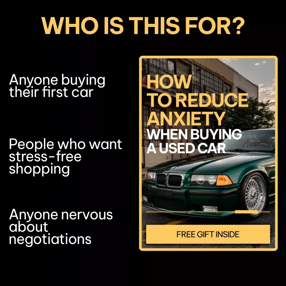 If you’re ready to stop feeling anxious and start feeling empowered, How to Reduce Anxiety When Buying a Used Car is your go-to resource. Download instantly and take the first step toward reducing anxiety when buying used cars and securing a deal you can feel good about.