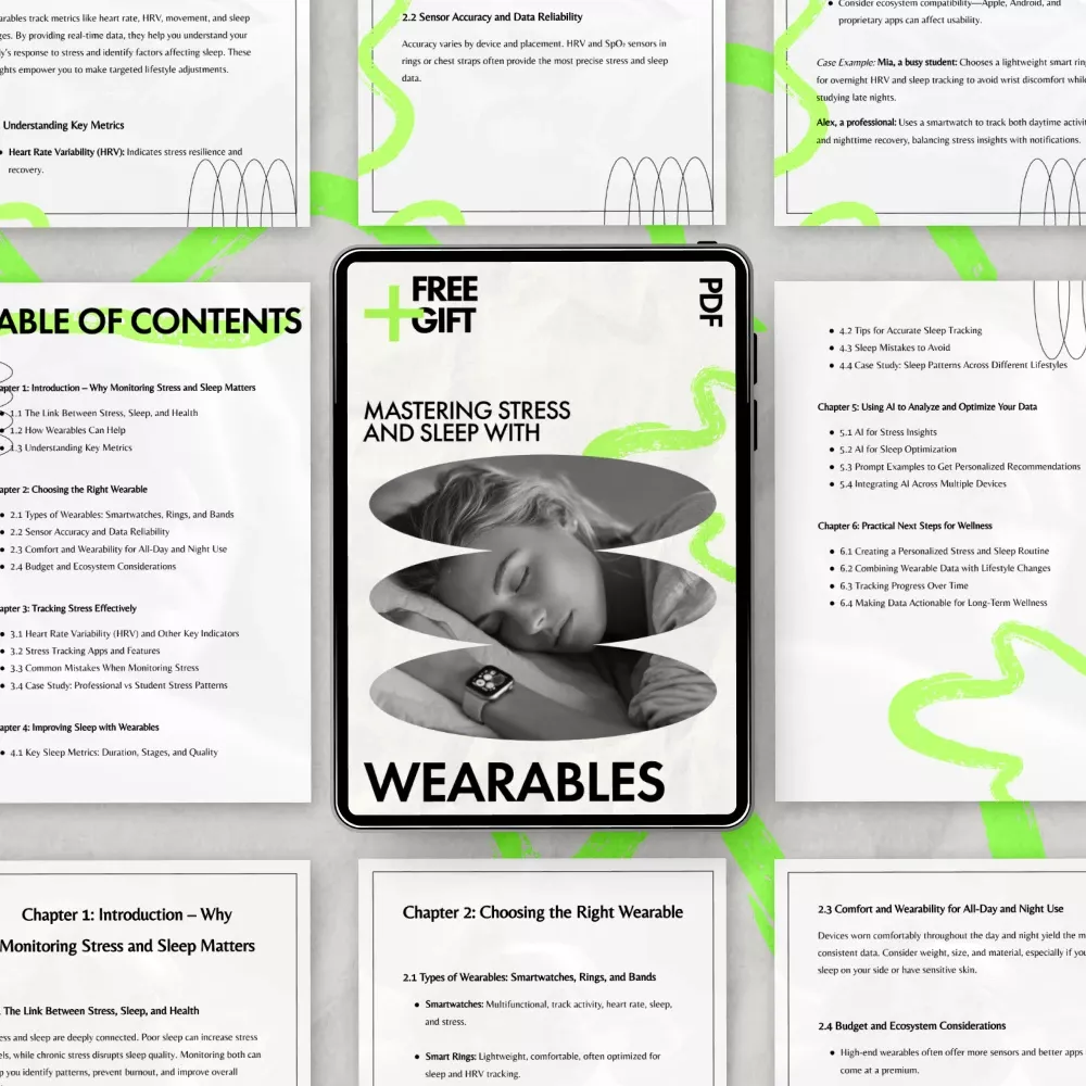 This ebook goes beyond surface-level advice by focusing on wearable tips for stress and sleep data that are realistic, science-informed, and easy to apply. Instead of generic wellness advice, you’ll learn how to interpret trends, avoid common tracking mistakes, and use AI tools to personalize your stress and sleep strategy across multiple devices.