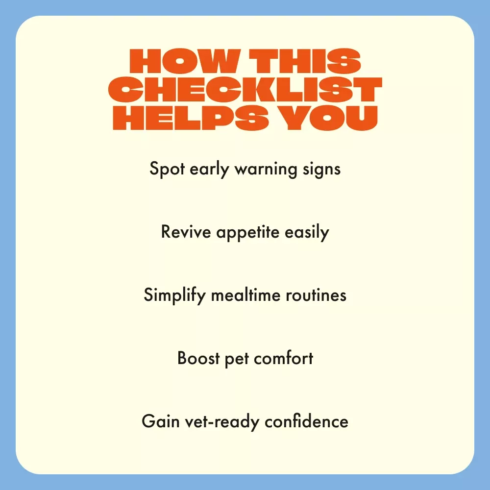 As an animal lover who has both cats and dogs at home, I find this checklist extremely handy when dealing with mealtime issues—it covers all bases from observing behaviors to knowing when to call the vet.