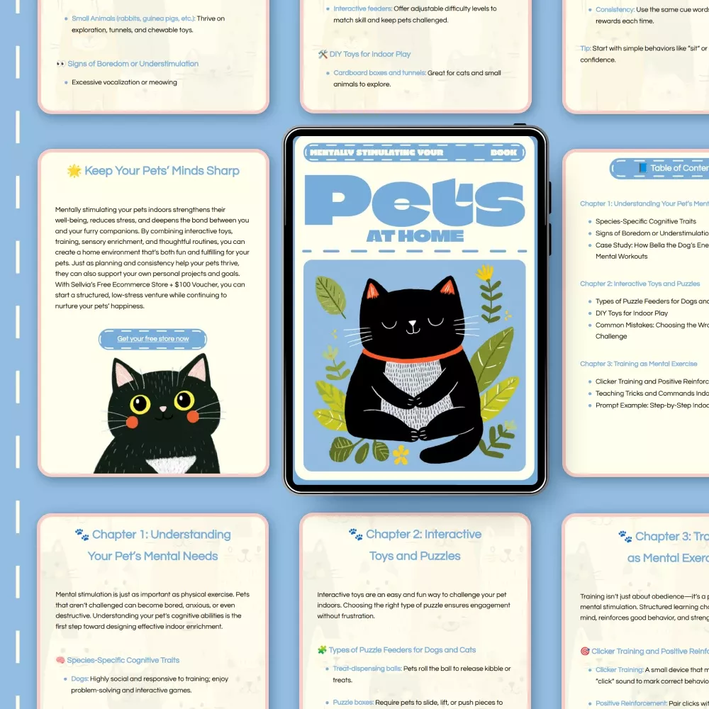 Unlike generic pet training guides, Mentally Stimulating Your Pets at Home blends psychology, sensory enrichment, and technology in one easy-to-follow digital download. With engaging examples like Bella’s transformation through mental workouts and step-by-step guidance, this eBook goes beyond theory — it helps you see real change in your pet’s mood and behavior.