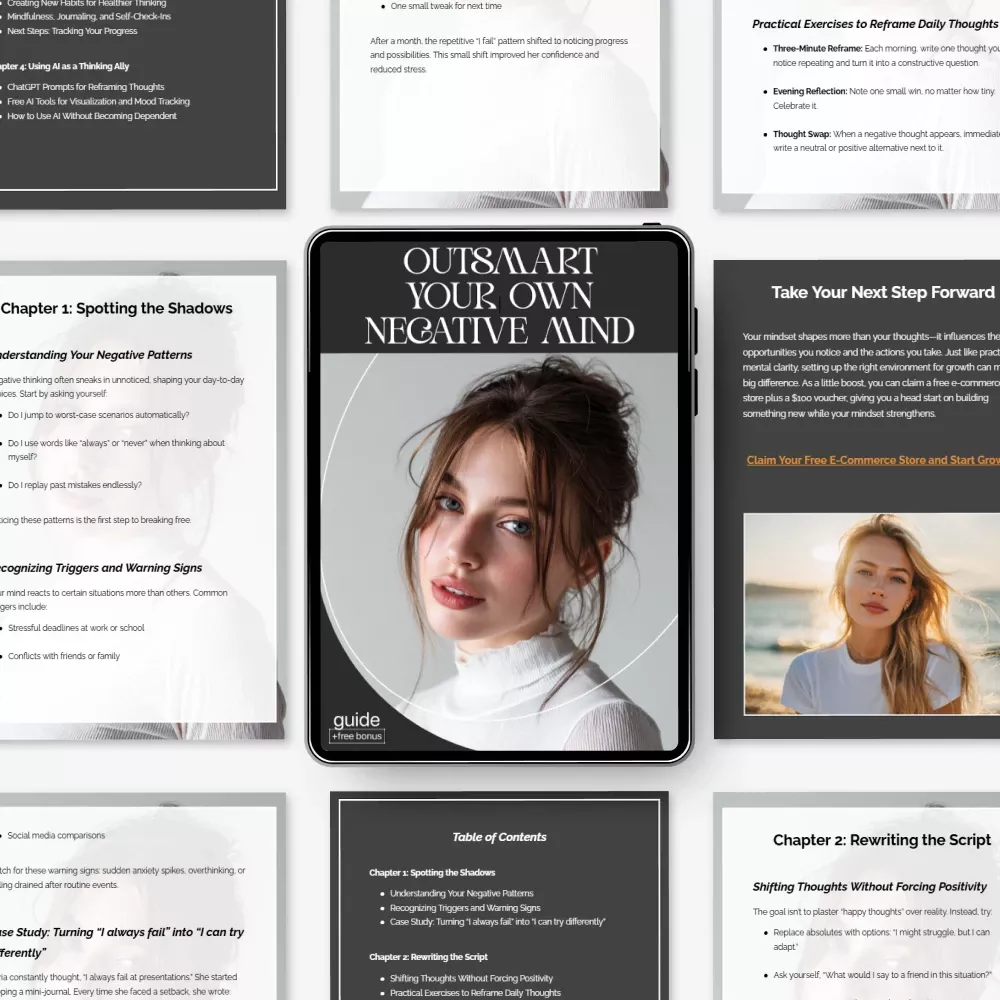 If your inner voice is constantly criticizing, doubting, or holding you back, Outsmart Your Own Negative Mind is your practical, no-fluff guide to finally taking control. This powerful digital download teaches you how to recognize your mental patterns, reframe destructive thoughts, and build lasting habits for a healthier mindset. Instead of forcing fake positivity, you’ll learn how to work with your brain in a realistic, sustainable way. With structured exercises, relatable examples, and modern AI tools, this guide helps you turn mental roadblocks into stepping stones—all at your own pace, from the comfort of home.