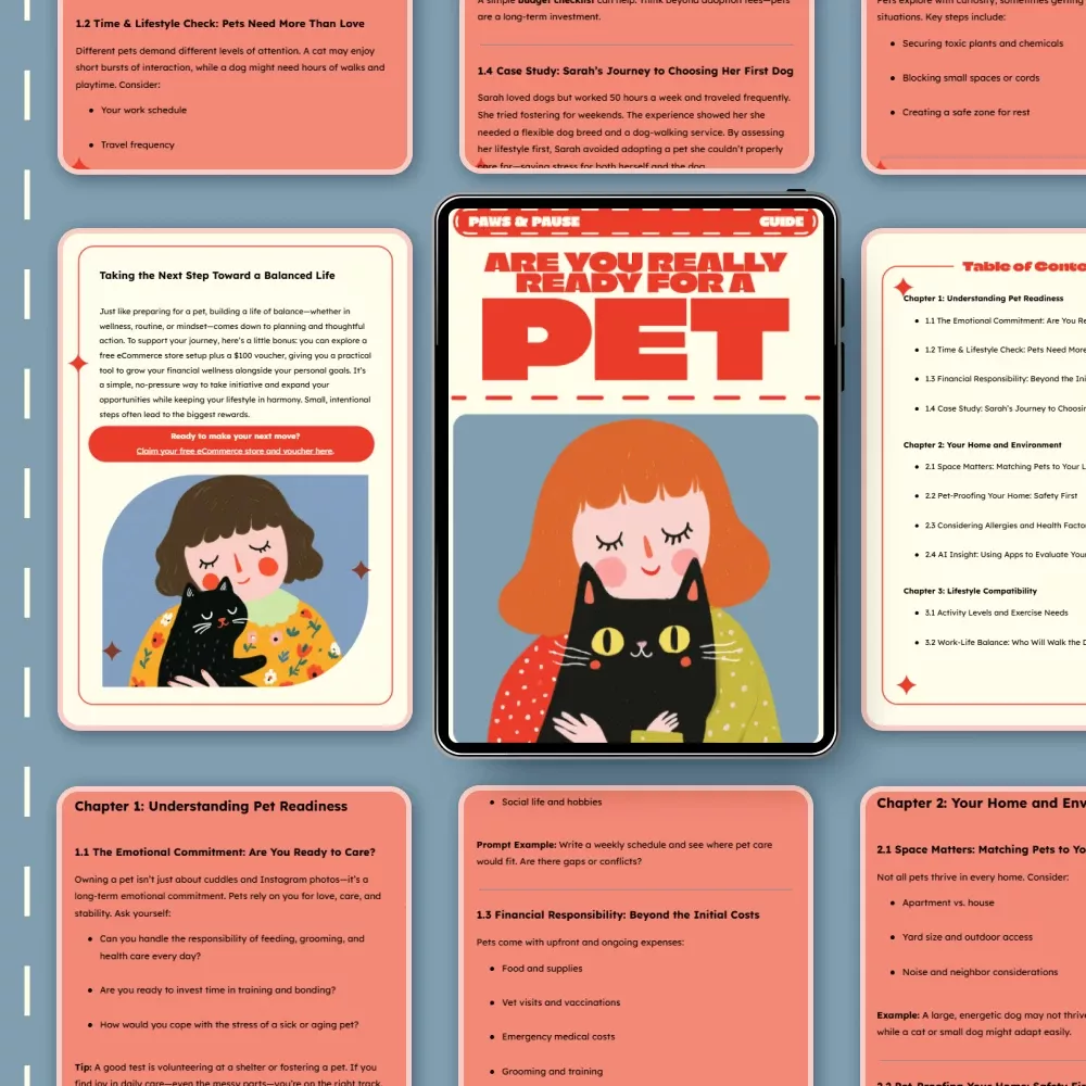 - Chapter 1: Understanding Pet Readiness – Explore emotional commitment, time, and financial responsibilities, plus a relatable case study on Sarah’s journey to her first dog.