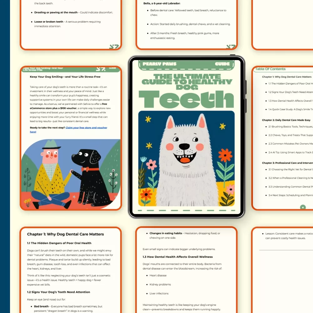 - Chapter 1: Why Dog Dental Care Matters – Learn about hidden dangers of poor oral health, signs your dog’s teeth need attention, and how dental health affects overall wellness.