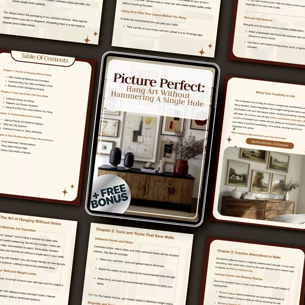 Discover the easiest and most stylish way to decorate your home with Picture Perfect: Hang Art Without Hammering a Single Hole — your ultimate eBook for mastering how to hang pictures without making holes everywhere. Whether you live in a rental, condo, or dorm room, this digital guide helps you achieve beautifully arranged walls without the damage or mess of nails and drills. With smart, renter-friendly techniques and AI-powered design tips, you’ll learn how to hang, display, and refresh your wall art like a pro — no hammer required!
