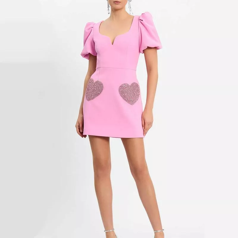 Step into a world of glamour and elegance with our latest addition to high street fashion – the Pink Sequin Heart Puff Sleeve Mini Dress. Designed to capture the essence of modern chic while celebrating feminine strength, this dress is a must-have for every woman seeking to make a bold fashion statement. Its enchanting pink hue, complemented by dazzling diamond decorations, sets the stage for an unforgettable appearance, no matter the occasion.