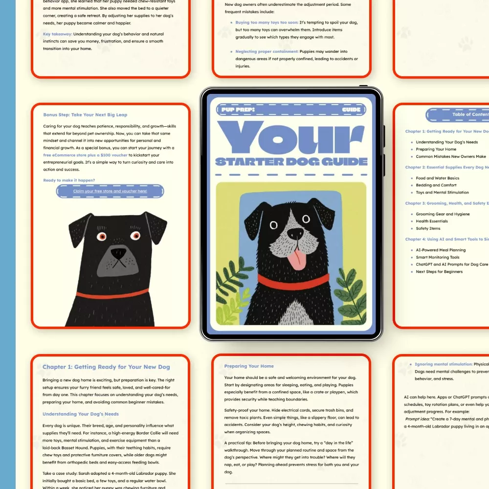 Getting a new dog is exciting—but it can also feel overwhelming. Pup Prep: Your Starter Dog Guide is your go-to digital companion for making dog ownership fun, organized, and stress-free. This downloadable guide combines practical tips, expert-backed advice, and even modern AI tools to help you confidently prepare for your furry friend’s arrival. Whether you’re a first-time dog parent or adding another pup to your family, this guide covers everything from essential gear to smart tech that simplifies care.