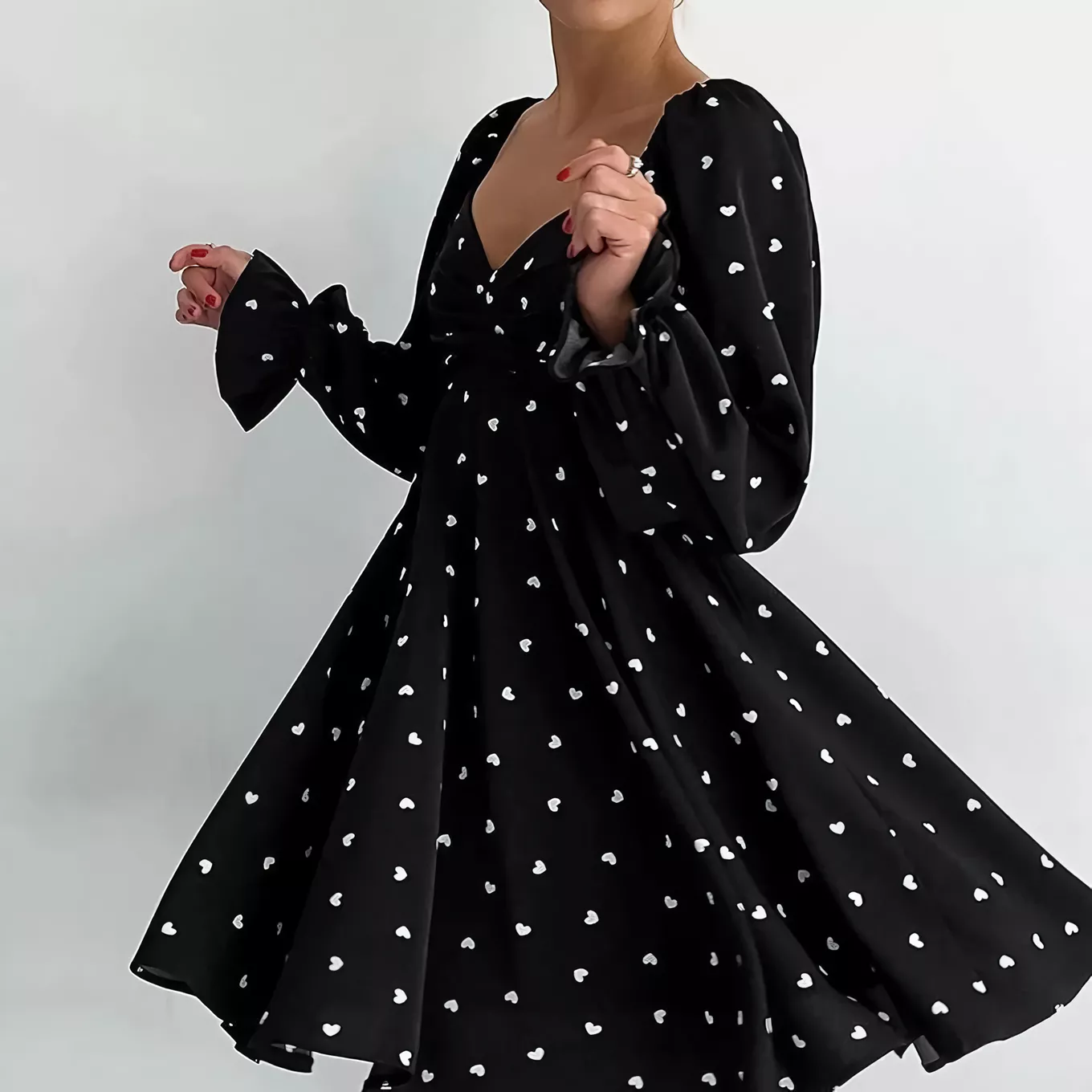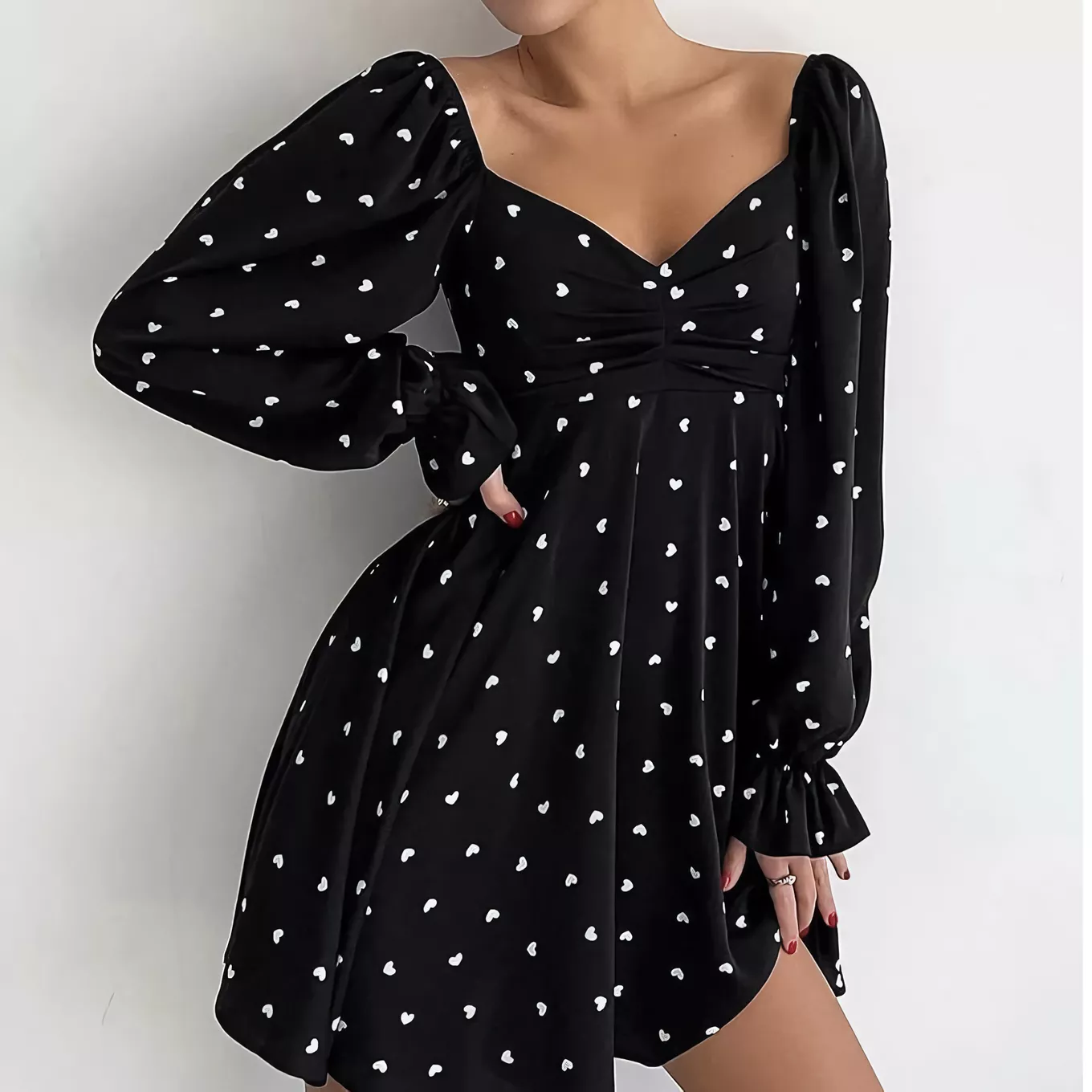 Step into a world where style meets elegance with our Sexy V-Neck Heart Print Mini Dress – a must-have for any woman looking to add a touch of charm and sophistication to her wardrobe. Perfect for the autumn season but versatile enough for all-year-round wear, this dress features a captivating heart print that promises to turn heads and steal hearts wherever you go.