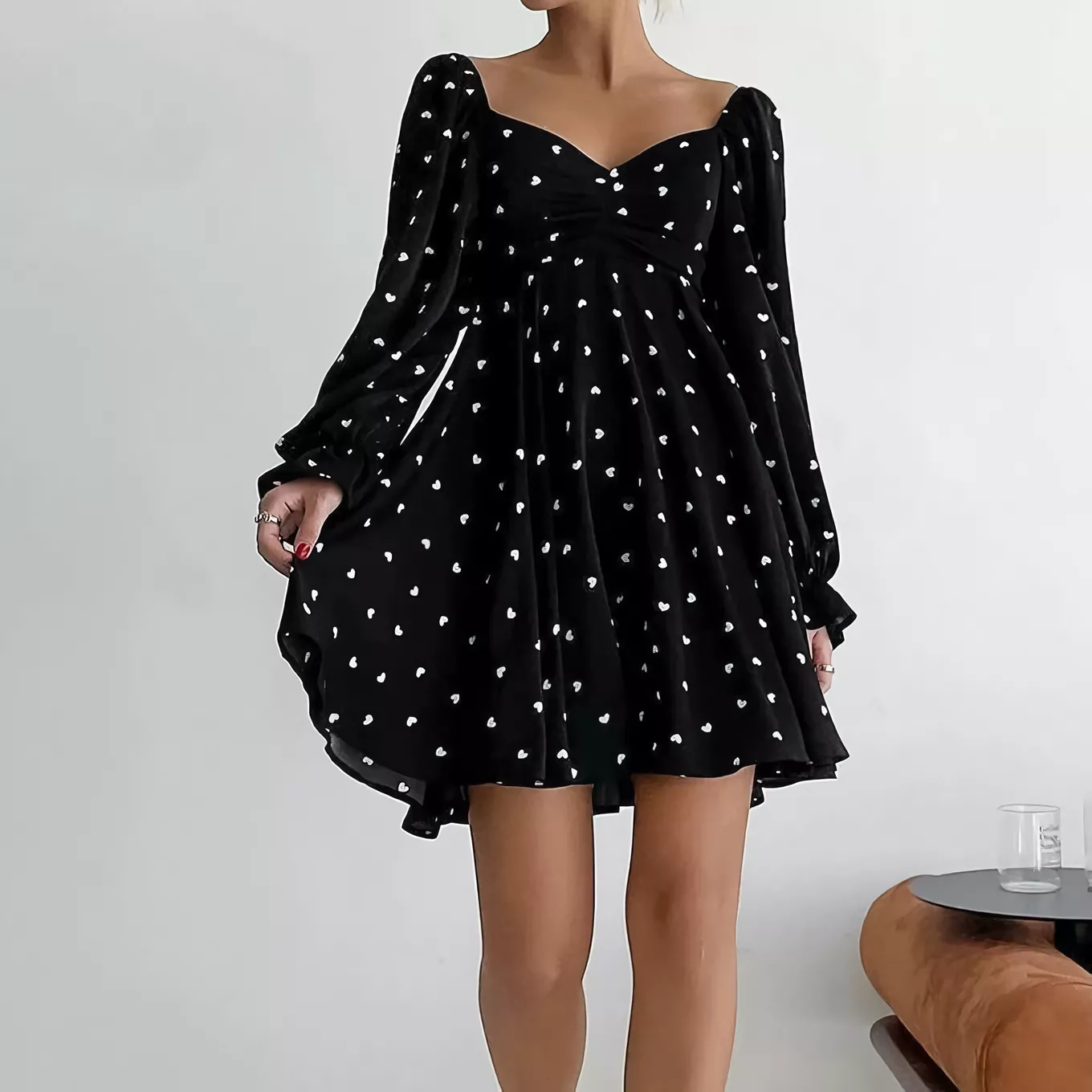 Step into a world where style meets elegance with our Sexy V-Neck Heart Print Mini Dress – a must-have for any woman looking to add a touch of charm and sophistication to her wardrobe. Perfect for the autumn season but versatile enough for all-year-round wear, this dress features a captivating heart print that promises to turn heads and steal hearts wherever you go.