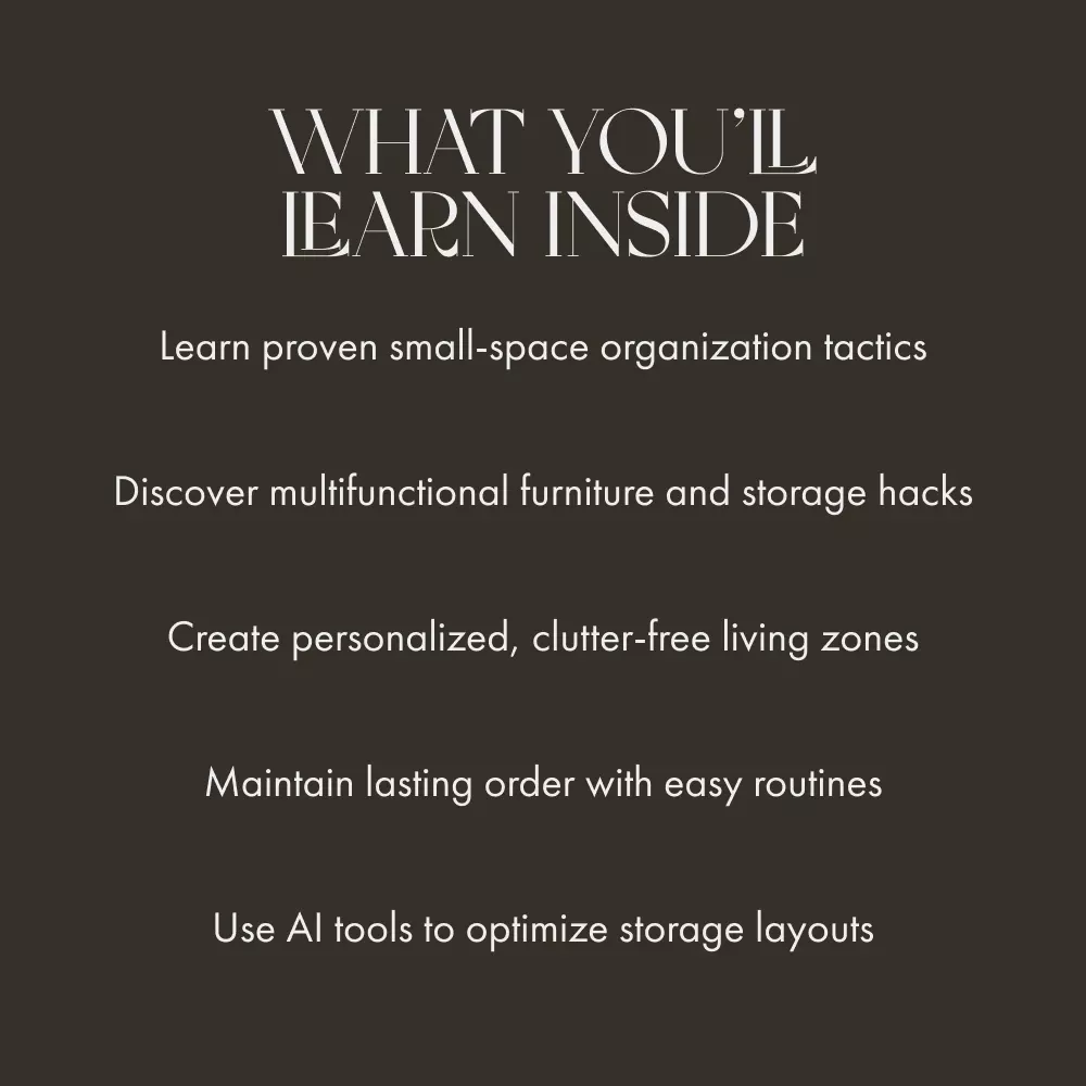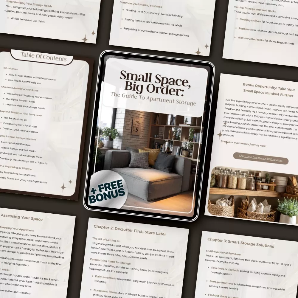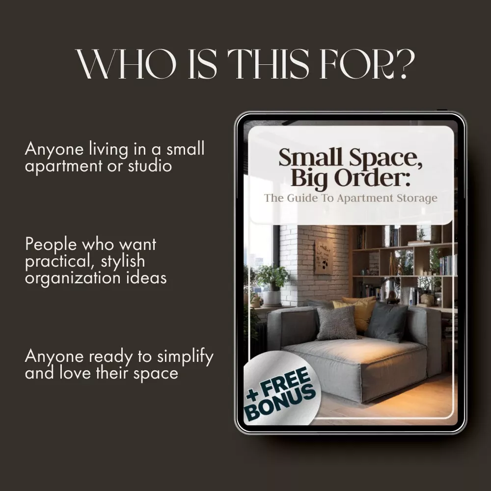 Living in a small apartment doesn’t mean living in clutter. Small Space, Big Order: The Guide to Apartment Storage is your complete step-by-step eBook designed to help you reclaim every inch of your home. If you’ve ever wondered how to organize storage for small apartments without sacrificing style or comfort, this guide gives you the practical strategies and creative solutions you need to turn tight spaces into beautifully efficient ones.