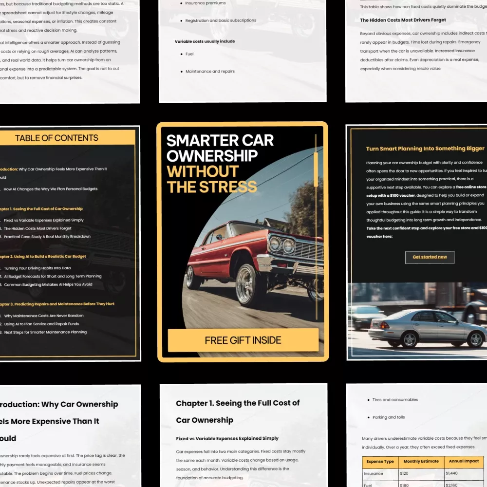 Owning a car shouldn’t feel like a financial guessing game. Smarter Car Ownership Without the Stress is a clear, practical ebook designed to help you finally understand where your money is going and how to plan ahead with confidence. This digital guide shows you how everyday drivers can use ai for planning car ownership budget decisions that actually reflect real life. No complex spreadsheets. No finance jargon. Just smarter planning that reduces stress, surprises, and costly mistakes.