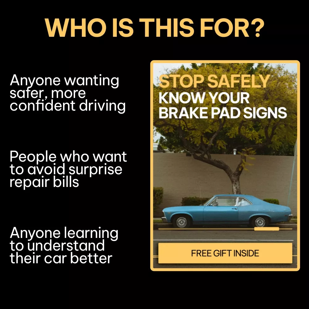 Perfect for new drivers, everyday commuters, DIY car-care beginners, car owners wanting to save money on repairs, and anyone who wants a better understanding of the signs of worn brake pads without needing advanced mechanical knowledge.