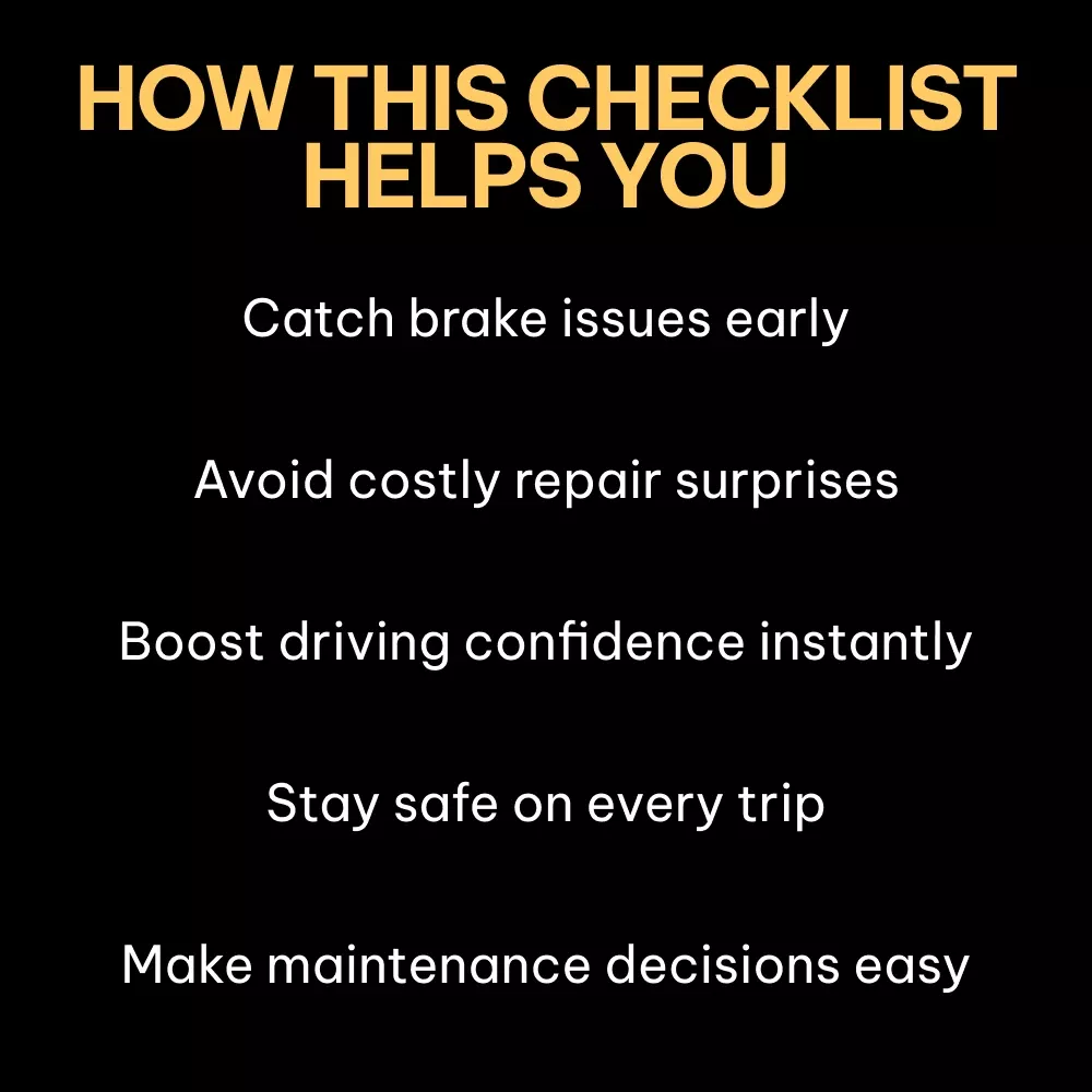 Unlike lengthy manuals or complex repair guides, this checklist simplifies the signs of worn brake pads into an easy, actionable format. It bridges everyday awareness with practical know-how, helping you feel confident without jargon or stress. It’s not just a checklist—it’s a tool that boosts your road safety awareness in minutes.