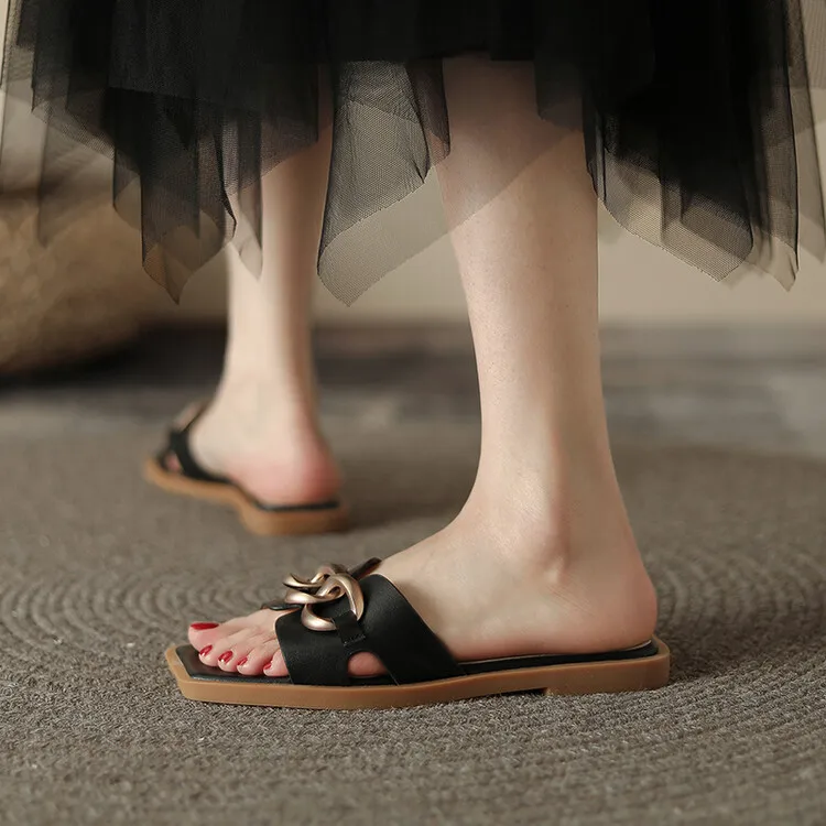 - Unique Design: Featuring a distinctive square toe and elegant metal decoration, these slippers are the epitome of modern style.