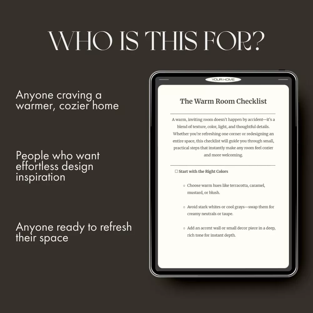 With The Warm Room Checklist, you’ll learn the small changes that make the biggest difference—how to combine colors, textures, and lighting to create a room that radiates comfort. Download your copy today and start transforming your space into the warm, inviting retreat you’ve always dreamed of.