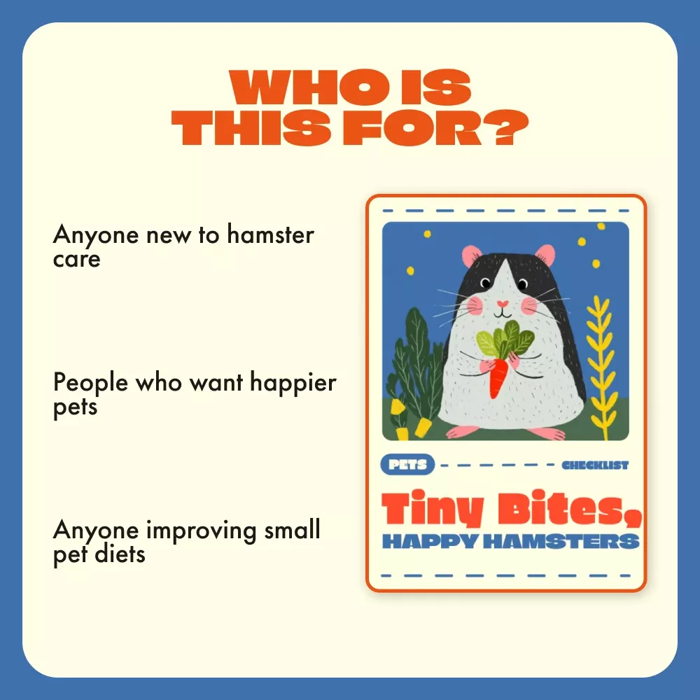 This checklist is perfect for hamster owners who want an easy, reliable reference for feeding their pets right. It’s especially useful for families, new pet parents, or anyone who wants to make sure their hamster’s meals are balanced and safe.