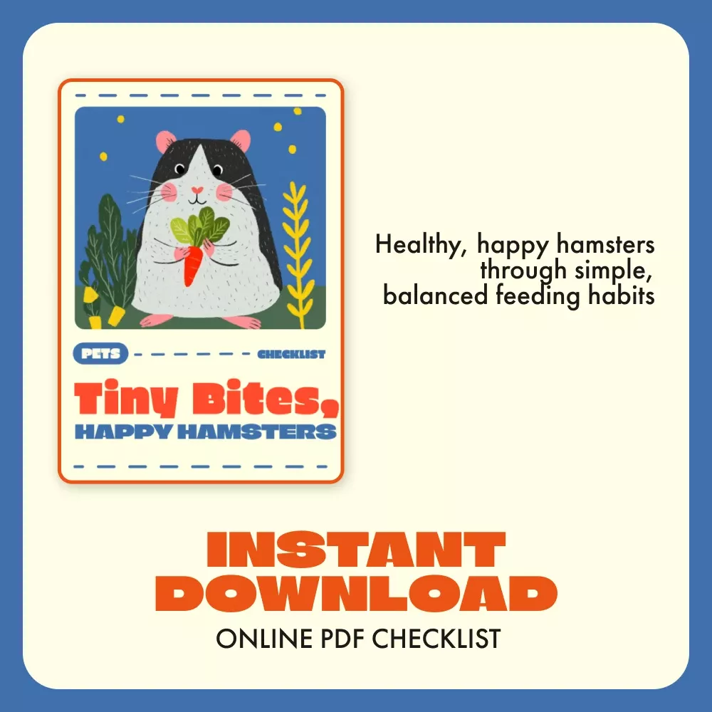 Keep your furry friend healthy, active, and full of joy with Tiny Bites, Happy Hamsters — the ultimate printable checklist designed to make feeding your hamster simple and stress-free. Whether you’re a first-time hamster owner or a seasoned pet lover, this digital guide helps you choose the best food for hamsters and create a balanced diet that supports your pet’s well-being. From daily meals to occasional treats, every tip in this checklist is crafted to keep your hamster nourished, hydrated, and thriving.