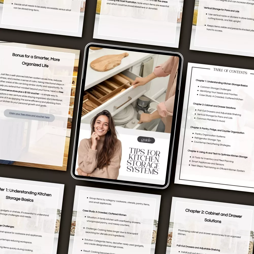Say goodbye to cluttered counters and overstuffed cabinets with Tips for Kitchen Storage Systems—a comprehensive digital download designed to help you reclaim your kitchen and streamline your daily routine. Whether you’re a busy home cook, a new homeowner, or someone looking to modernize your kitchen, this guide blends practical organization strategies with cutting-edge technology to create a kitchen that truly works for you.