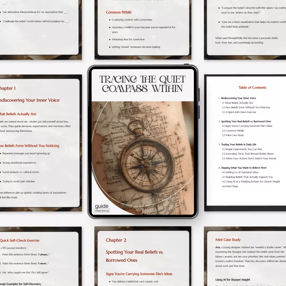“Tracing the Quiet Compass Within” is a reflective, practical digital guide designed to help you untangle your thoughts, examine your belief system, and reconnect with your inner direction. If you’ve ever felt stuck repeating patterns or doubting your own voice, this guide gently walks you through understanding where your beliefs come from, how they shape your decisions, and how you can consciously redesign them. It blends psychology, self-inquiry, and modern reflective tools in a calm, supportive way that feels more like a conversation than a lecture.