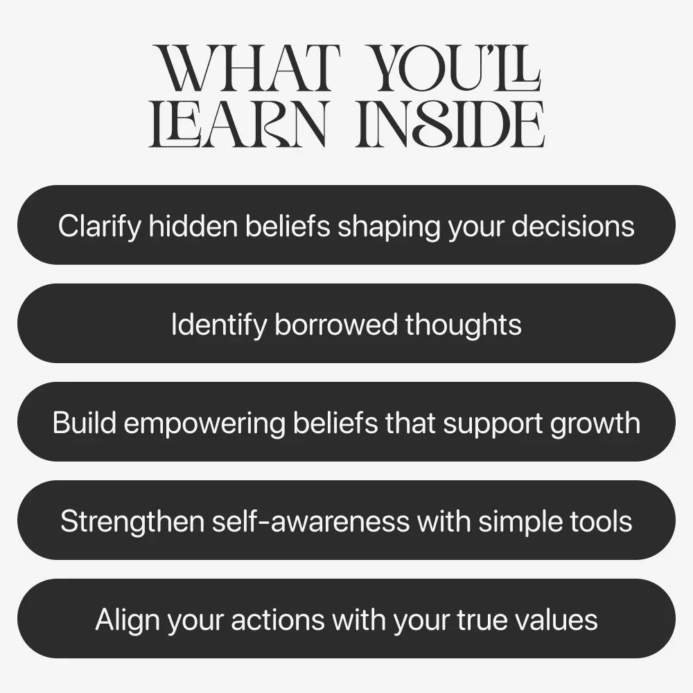 This guide is for anyone interested in personal growth, mindset work, self-discovery, and emotional awareness. It’s perfect for overthinkers, creatives, coaches, therapists, students, and curious minds who want to understand how their beliefs influence their life and how to consciously reshape them.