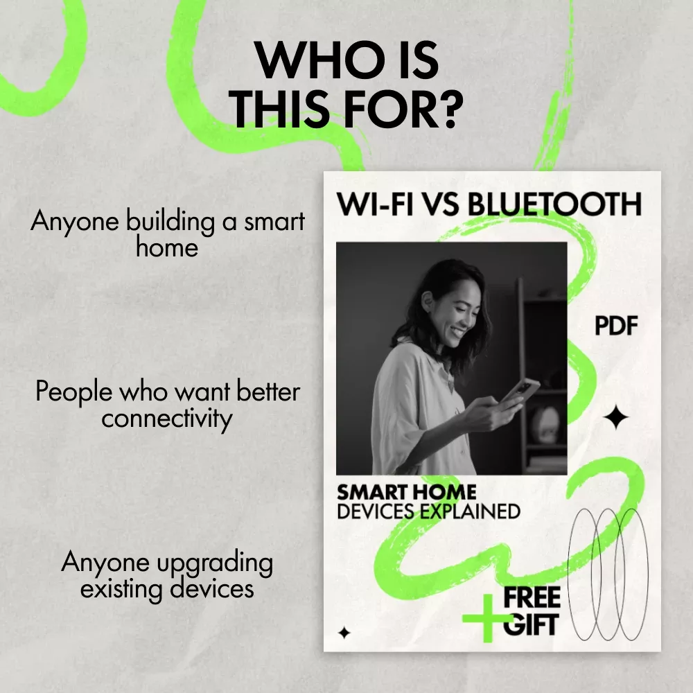 This ebook is ideal for homeowners, renters, smart home beginners, tech-curious shoppers, and anyone comparing wifi vs bluetooth smart home devices before buying. It’s also valuable for those experiencing slow performance, limited range, or battery drain and want clear answers.