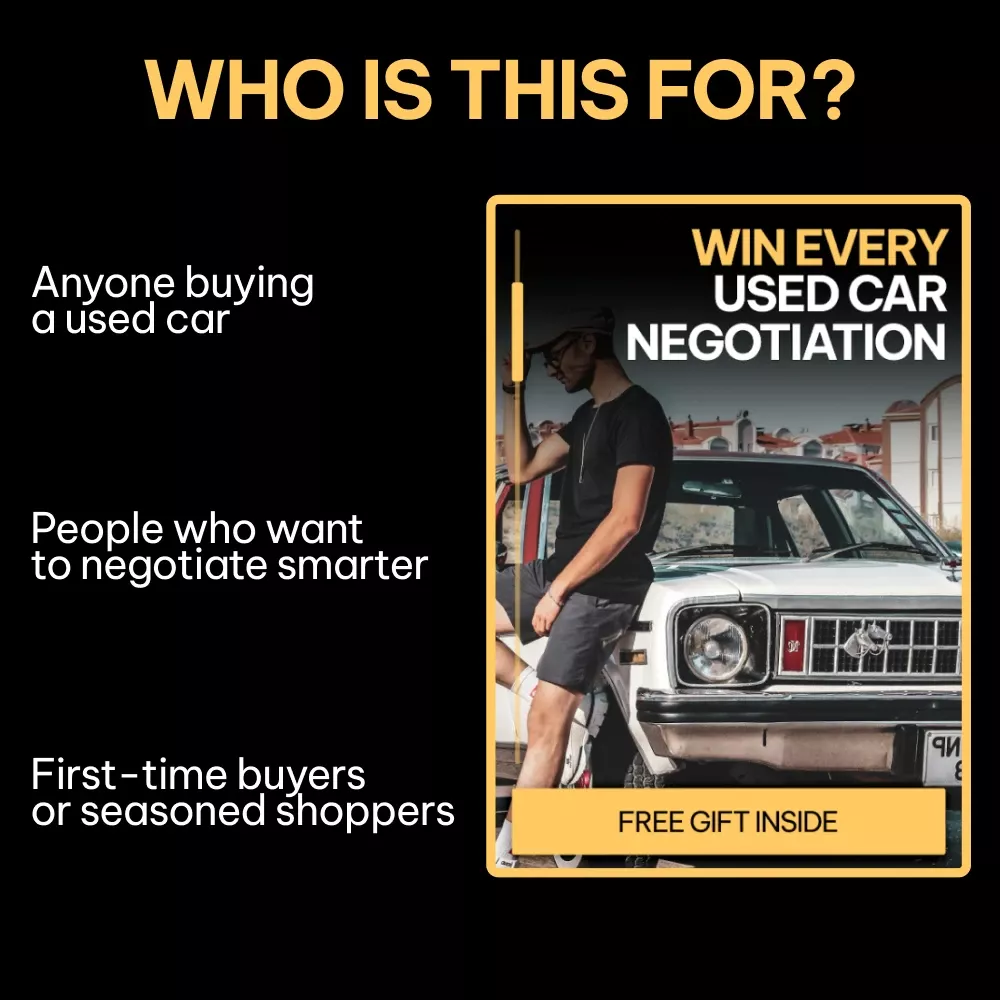This eBook is perfect for anyone looking to get the best deal on a used car. Whether you’re shopping at a dealership or negotiating with a private seller, this guide is tailored to help you win the negotiation game. It’s ideal for buyers who want to skip the stress and confusion of haggling and walk away with a fair, competitive price.