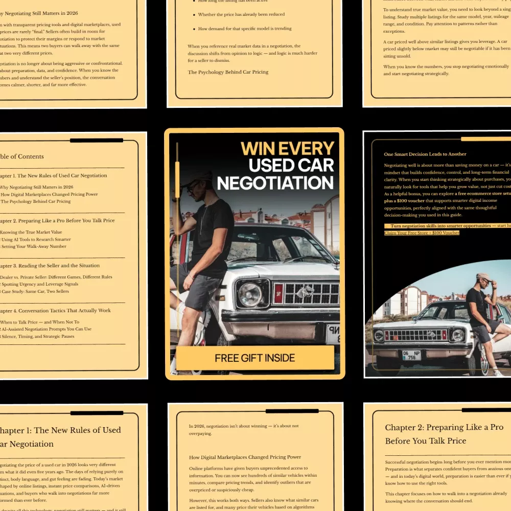 Ready to drive away with the best deal on your next used car? Whether you’re a first-time buyer or a seasoned pro, mastering the art of negotiation is key to securing the best price. “Win Every Used Car Negotiation” is your ultimate guide to navigating the complex world of used car deals in 2026. With cutting-edge tactics and insights, this eBook arms you with the tools you need to negotiate like a pro and save big.